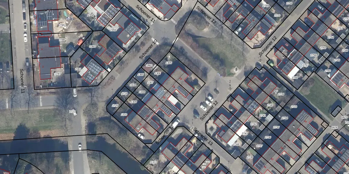 Het perceel waarop Schoener 12 21 staat heeft een oppervlakte van 199 m². Dit is een middelgroot perceel. De perceeloppervlakte wordt geregistreerd door het Kadaster. Gedetailleerde informatie over de maten van dit perceel kunt u vinden in het rapport Kadastrale kaart met maatvoering van Schoener 12 21.