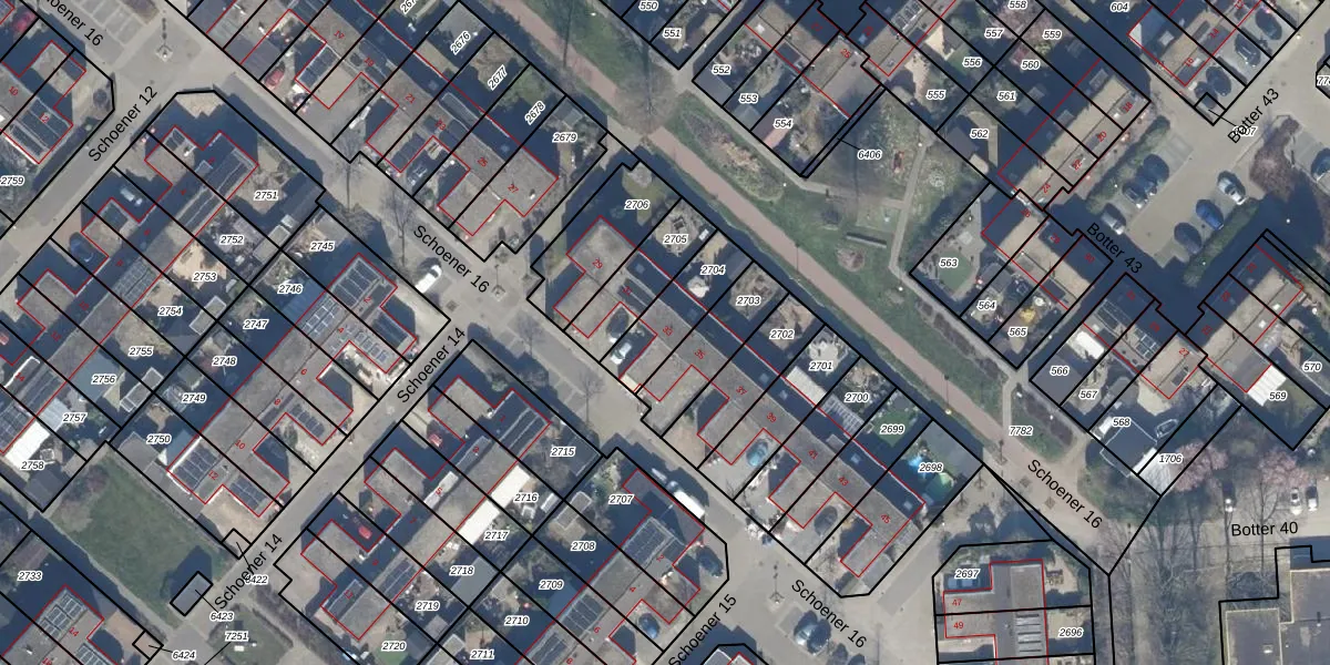 Het perceel waarop Schoener 16 33 staat heeft een oppervlakte van 194 m². Dit is een middelgroot perceel. De perceeloppervlakte wordt geregistreerd door het Kadaster. Gedetailleerde informatie over de maten van dit perceel kunt u vinden in het rapport Kadastrale kaart met maatvoering van Schoener 16 33.