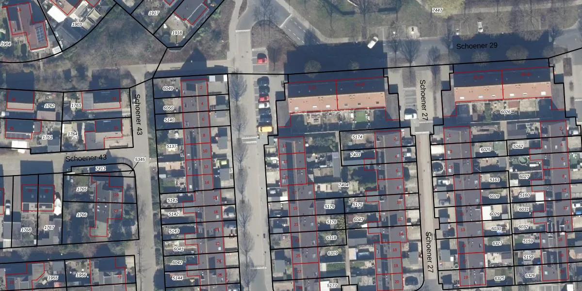 Het perceel waarop Schoener 26 11 staat heeft een oppervlakte van 1675 m². Dit is een zeer groot perceel. De perceeloppervlakte wordt geregistreerd door het Kadaster. Gedetailleerde informatie over de maten van dit perceel kunt u vinden in het rapport Kadastrale kaart met maatvoering van Schoener 26 11.