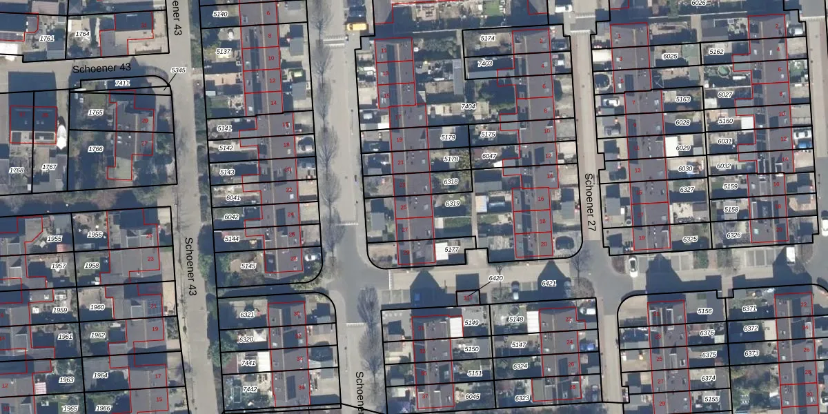 Het perceel waarop Schoener 26 25 staat heeft een oppervlakte van 854 m². Dit is een groot perceel. De perceeloppervlakte wordt geregistreerd door het Kadaster. Gedetailleerde informatie over de maten van dit perceel kunt u vinden in het rapport Kadastrale kaart met maatvoering van Schoener 26 25.