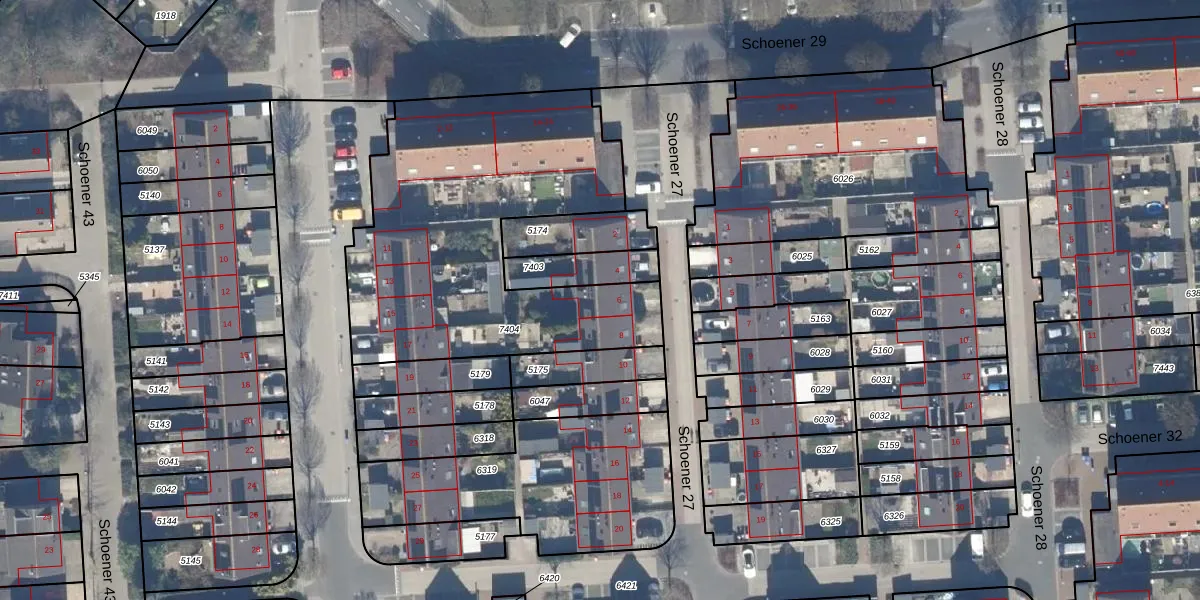 Het perceel waarop Schoener 27 6 staat heeft een oppervlakte van 1675 m². Dit is een zeer groot perceel. De perceeloppervlakte wordt geregistreerd door het Kadaster. Gedetailleerde informatie over de maten van dit perceel kunt u vinden in het rapport Kadastrale kaart met maatvoering van Schoener 27 6.