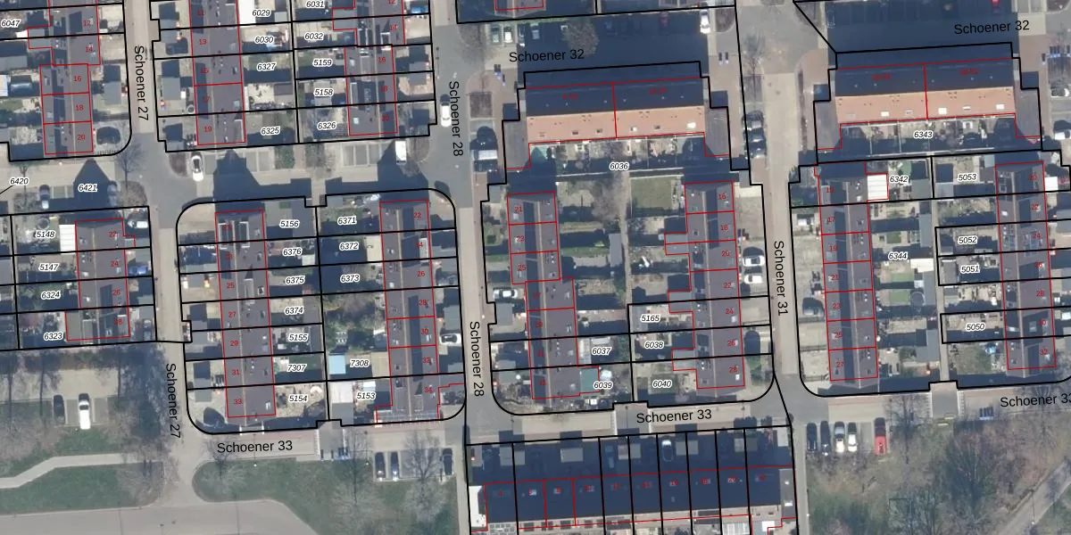 Het perceel waarop Schoener 28 25 staat heeft een oppervlakte van 2185 m². Dit is een zeer groot perceel. De perceeloppervlakte wordt geregistreerd door het Kadaster. Gedetailleerde informatie over de maten van dit perceel kunt u vinden in het rapport Kadastrale kaart met maatvoering van Schoener 28 25.