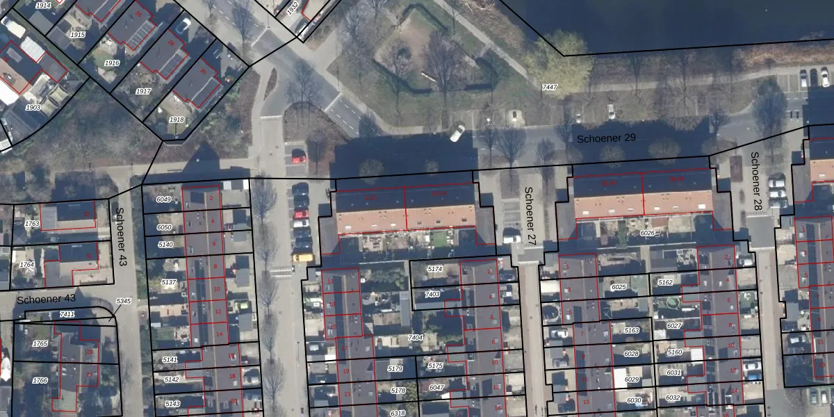 Het perceel waarop Schoener 29 14 staat heeft een oppervlakte van 1675 m². Dit is een zeer groot perceel. De perceeloppervlakte wordt geregistreerd door het Kadaster. Gedetailleerde informatie over de maten van dit perceel kunt u vinden in het rapport Kadastrale kaart met maatvoering van Schoener 29 14.
