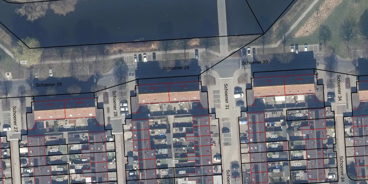 Het perceel waarop Schoener 29 64 staat heeft een oppervlakte van 2268 m². Dit is een zeer groot perceel. De perceeloppervlakte wordt geregistreerd door het Kadaster. Gedetailleerde informatie over de maten van dit perceel kunt u vinden in het rapport Kadastrale kaart met maatvoering van Schoener 29 64.