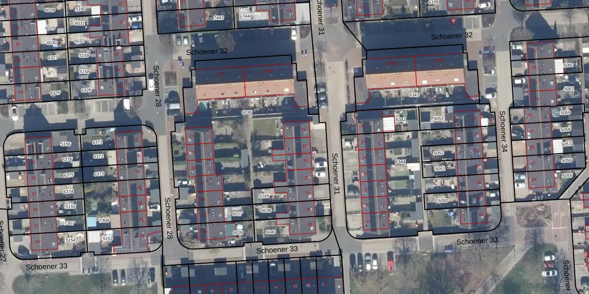 Het perceel waarop Schoener 31 18 staat heeft een oppervlakte van 2185 m². Dit is een zeer groot perceel. De perceeloppervlakte wordt geregistreerd door het Kadaster. Gedetailleerde informatie over de maten van dit perceel kunt u vinden in het rapport Kadastrale kaart met maatvoering van Schoener 31 18.