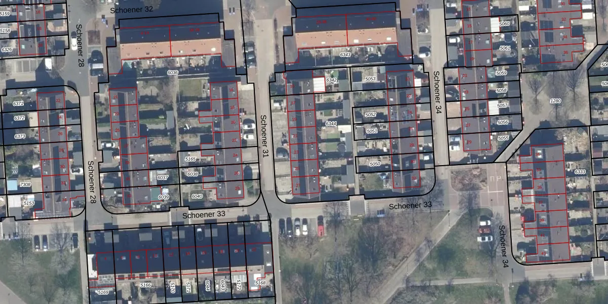 Het perceel waarop Schoener 31 23 staat heeft een oppervlakte van 1440 m². Dit is een zeer groot perceel. De perceeloppervlakte wordt geregistreerd door het Kadaster. Gedetailleerde informatie over de maten van dit perceel kunt u vinden in het rapport Kadastrale kaart met maatvoering van Schoener 31 23.