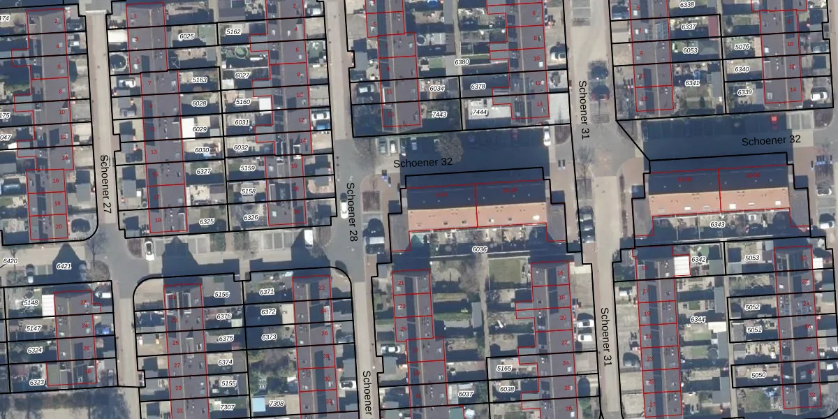 Het perceel waarop Schoener 32 10 staat heeft een oppervlakte van 2185 m². Dit is een zeer groot perceel. De perceeloppervlakte wordt geregistreerd door het Kadaster. Gedetailleerde informatie over de maten van dit perceel kunt u vinden in het rapport Kadastrale kaart met maatvoering van Schoener 32 10.