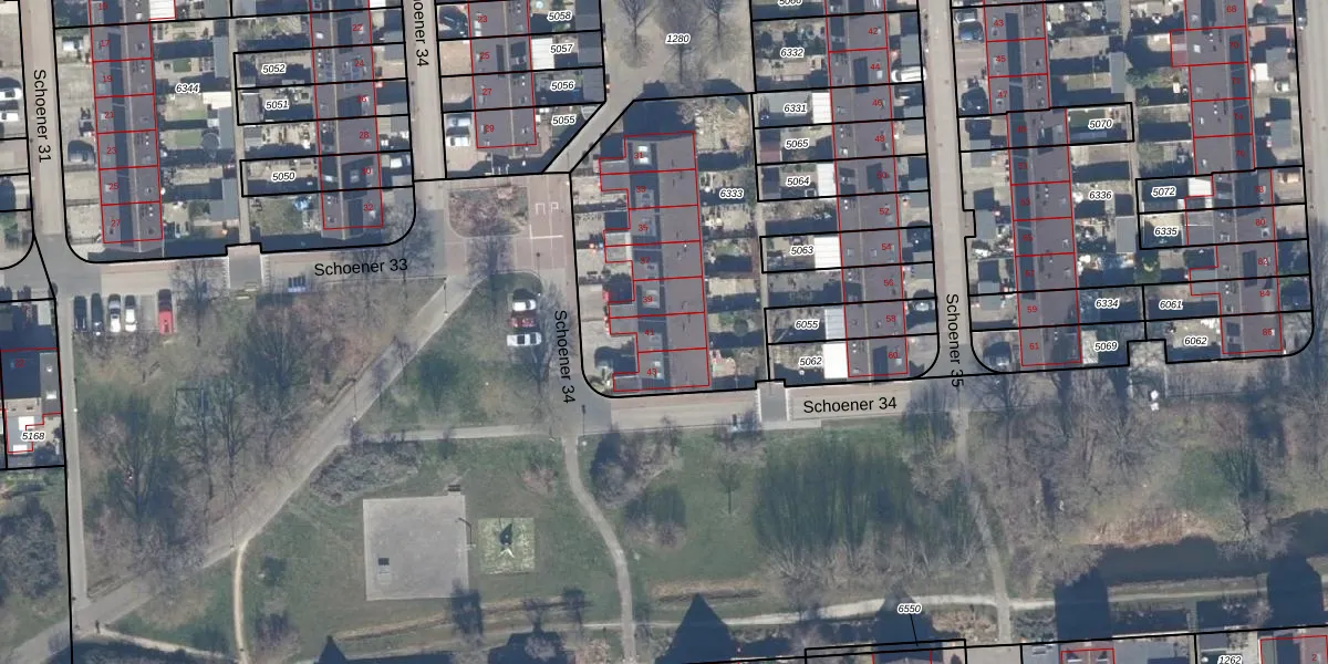 Schoener 34 41 is gelegen op kadastraal perceel LLS00O6333. Deze kadastrale aanduiding is uniek en wordt gebruikt door het Kadaster om eigendomsrechten en andere zakelijke rechten vast te leggen. Het perceel maakt onderdeel uit van de kadastrale gemeente Lelystad.