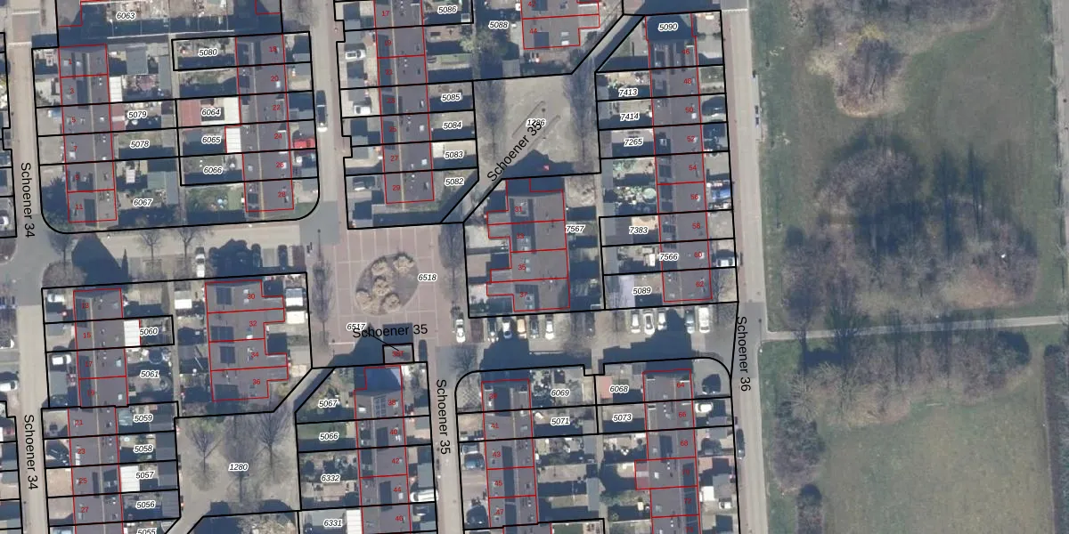 Het perceel waarop Schoener 35 35 staat heeft een oppervlakte van 897 m². Dit is een groot perceel. De perceeloppervlakte wordt geregistreerd door het Kadaster. Gedetailleerde informatie over de maten van dit perceel kunt u vinden in het rapport Kadastrale kaart met maatvoering van Schoener 35 35.