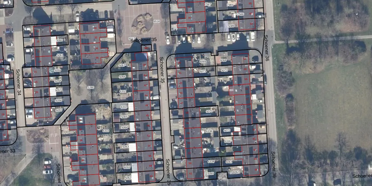 Het perceel waarop Schoener 35 45 staat heeft een oppervlakte van 1811 m². Dit is een zeer groot perceel. De perceeloppervlakte wordt geregistreerd door het Kadaster. Gedetailleerde informatie over de maten van dit perceel kunt u vinden in het rapport Kadastrale kaart met maatvoering van Schoener 35 45.