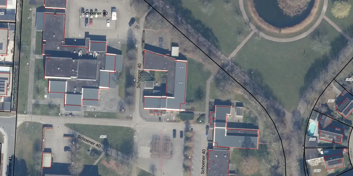 Het perceel waarop Schoener 40 10-A staat heeft een oppervlakte van 1,9 ha. Dit is een zeer groot perceel. De perceeloppervlakte wordt geregistreerd door het Kadaster. Gedetailleerde informatie over de maten van dit perceel kunt u vinden in het rapport Kadastrale kaart met maatvoering van Schoener 40 10-A.