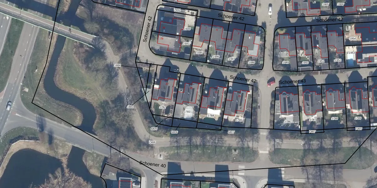 Het perceel waarop Schoener 42 25 staat heeft een oppervlakte van 312 m². Dit is een groot perceel. De perceeloppervlakte wordt geregistreerd door het Kadaster. Gedetailleerde informatie over de maten van dit perceel kunt u vinden in het rapport Kadastrale kaart met maatvoering van Schoener 42 25.