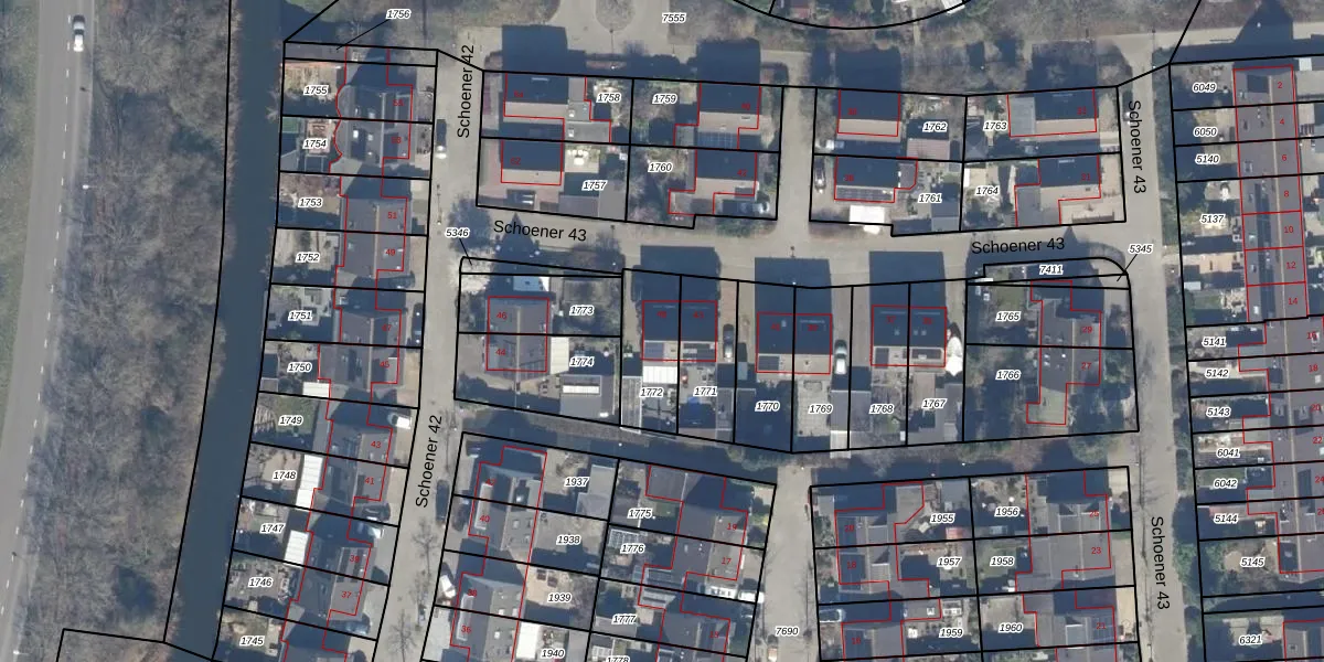 Het perceel waarop Schoener 43 45 staat heeft een oppervlakte van 209 m². Dit is een middelgroot perceel. De perceeloppervlakte wordt geregistreerd door het Kadaster. Gedetailleerde informatie over de maten van dit perceel kunt u vinden in het rapport Kadastrale kaart met maatvoering van Schoener 43 45.