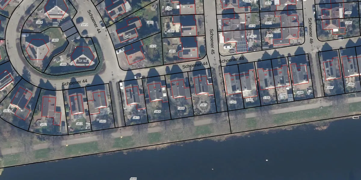 Het perceel waarop Schoener 44 36 staat heeft een oppervlakte van 319 m². Dit is een groot perceel. De perceeloppervlakte wordt geregistreerd door het Kadaster. Gedetailleerde informatie over de maten van dit perceel kunt u vinden in het rapport Kadastrale kaart met maatvoering van Schoener 44 36.