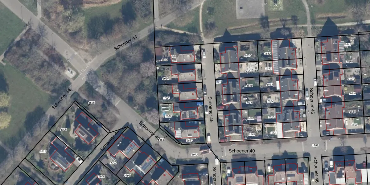 Schoener 45 6 is gelegen op kadastraal perceel LLS00O1665. Deze kadastrale aanduiding is uniek en wordt gebruikt door het Kadaster om eigendomsrechten en andere zakelijke rechten vast te leggen. Het perceel maakt onderdeel uit van de kadastrale gemeente Lelystad.