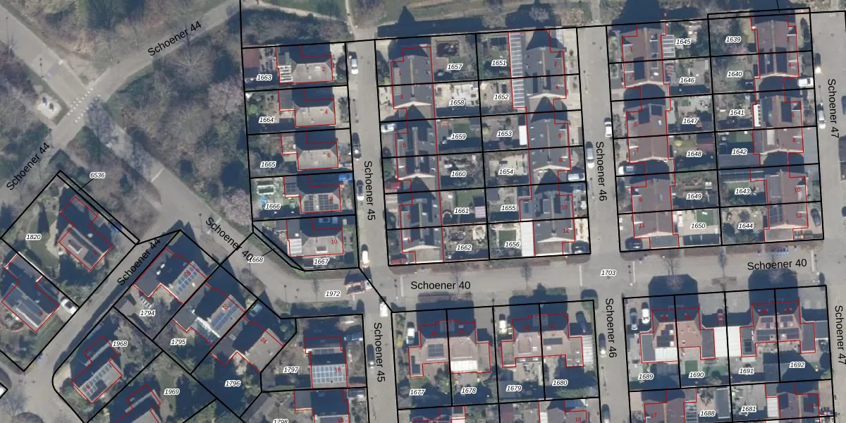Het perceel waarop Schoener 45 9 staat heeft een oppervlakte van 203 m². Dit is een middelgroot perceel. De perceeloppervlakte wordt geregistreerd door het Kadaster. Gedetailleerde informatie over de maten van dit perceel kunt u vinden in het rapport Kadastrale kaart met maatvoering van Schoener 45 9.