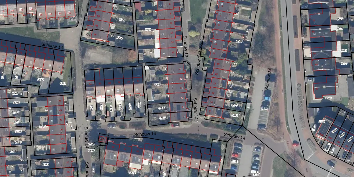 Het perceel waarop Schouw 14 13 staat heeft een oppervlakte van 546 m². Dit is een groot perceel. De perceeloppervlakte wordt geregistreerd door het Kadaster. Gedetailleerde informatie over de maten van dit perceel kunt u vinden in het rapport Kadastrale kaart met maatvoering van Schouw 14 13.