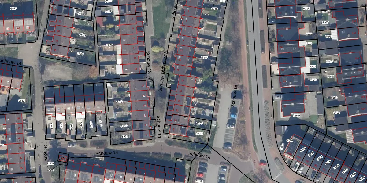Het perceel waarop Schouw 14 16 staat heeft een oppervlakte van 1733 m². Dit is een zeer groot perceel. De perceeloppervlakte wordt geregistreerd door het Kadaster. Gedetailleerde informatie over de maten van dit perceel kunt u vinden in het rapport Kadastrale kaart met maatvoering van Schouw 14 16.