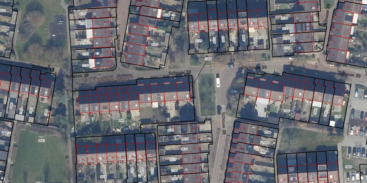 Het perceel waarop Schouw 39 39 staat heeft een oppervlakte van 1672 m². Dit is een zeer groot perceel. De perceeloppervlakte wordt geregistreerd door het Kadaster. Gedetailleerde informatie over de maten van dit perceel kunt u vinden in het rapport Kadastrale kaart met maatvoering van Schouw 39 39.