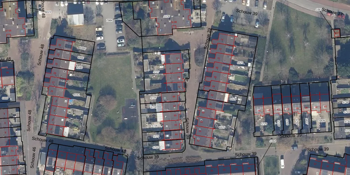Het perceel waarop Schouw 39 71 staat heeft een oppervlakte van 602 m². Dit is een groot perceel. De perceeloppervlakte wordt geregistreerd door het Kadaster. Gedetailleerde informatie over de maten van dit perceel kunt u vinden in het rapport Kadastrale kaart met maatvoering van Schouw 39 71.