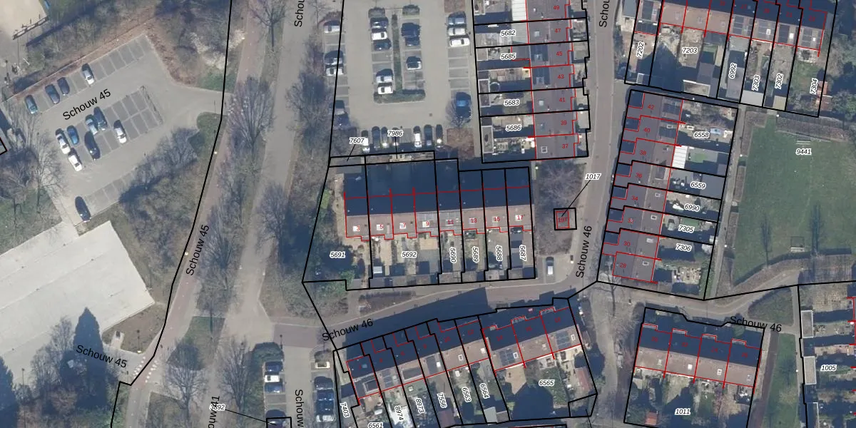 Het perceel waarop Schouw 46 9 staat heeft een oppervlakte van 471 m². Dit is een groot perceel. De perceeloppervlakte wordt geregistreerd door het Kadaster. Gedetailleerde informatie over de maten van dit perceel kunt u vinden in het rapport Kadastrale kaart met maatvoering van Schouw 46 9.