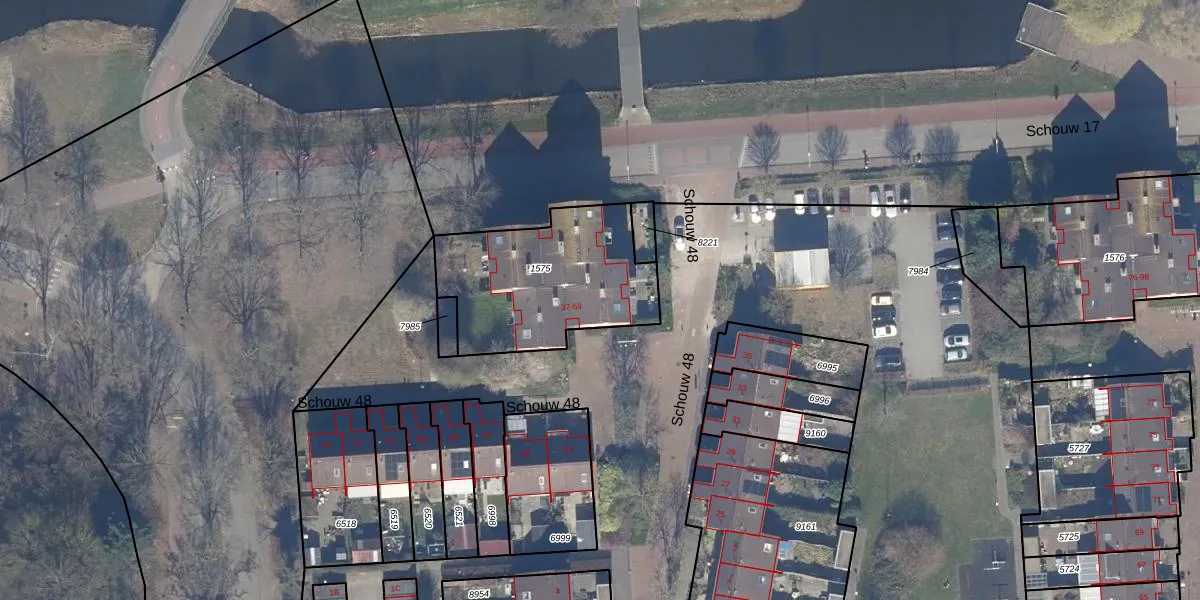 Het perceel waarop Schouw 48 47 staat heeft een oppervlakte van 683 m². Dit is een groot perceel. De perceeloppervlakte wordt geregistreerd door het Kadaster. Gedetailleerde informatie over de maten van dit perceel kunt u vinden in het rapport Kadastrale kaart met maatvoering van Schouw 48 47.