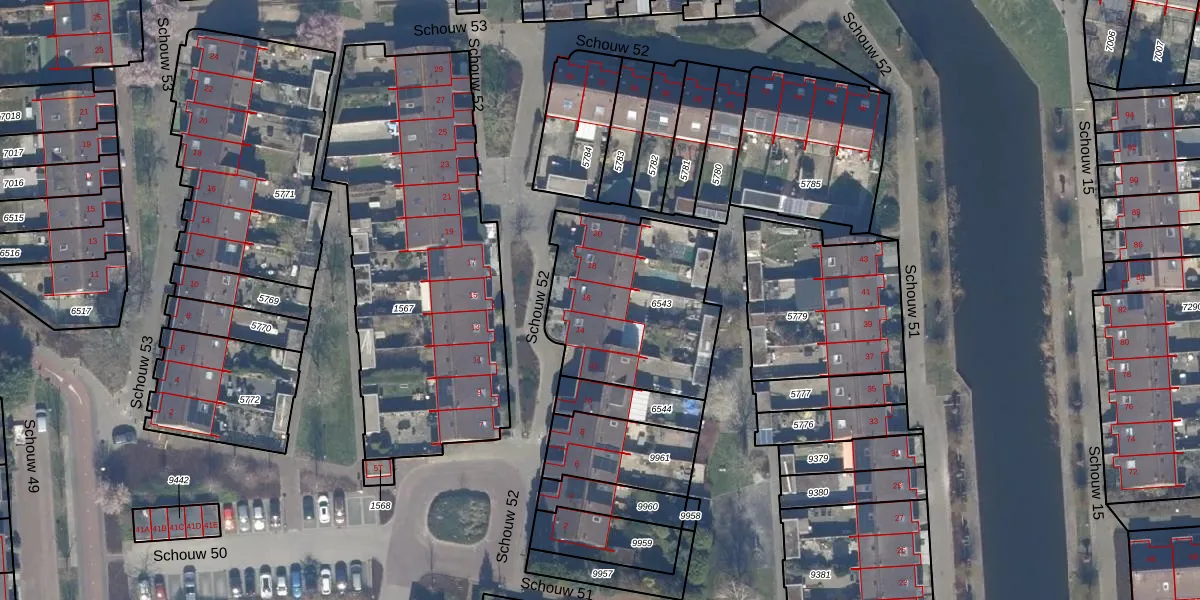 Het perceel waarop Schouw 52 16 staat heeft een oppervlakte van 740 m². Dit is een groot perceel. De perceeloppervlakte wordt geregistreerd door het Kadaster. Gedetailleerde informatie over de maten van dit perceel kunt u vinden in het rapport Kadastrale kaart met maatvoering van Schouw 52 16.