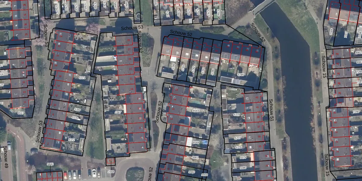 Het perceel waarop Schouw 52 20 staat heeft een oppervlakte van 740 m². Dit is een groot perceel. De perceeloppervlakte wordt geregistreerd door het Kadaster. Gedetailleerde informatie over de maten van dit perceel kunt u vinden in het rapport Kadastrale kaart met maatvoering van Schouw 52 20.