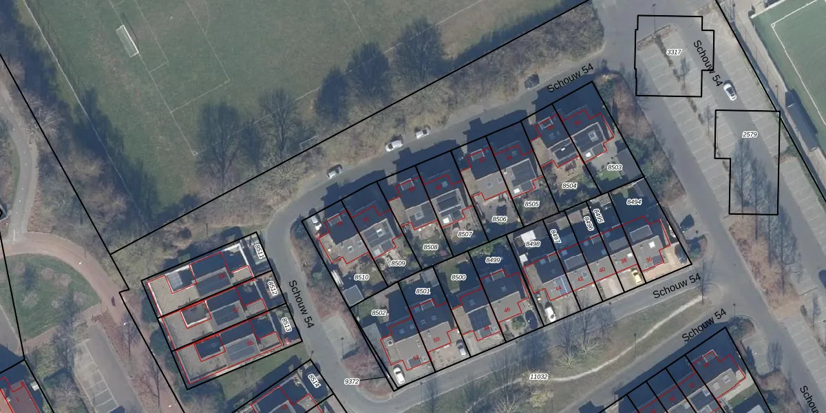 Het perceel waarop Schouw 54 58 staat heeft een oppervlakte van 222 m². Dit is een middelgroot perceel. De perceeloppervlakte wordt geregistreerd door het Kadaster. Gedetailleerde informatie over de maten van dit perceel kunt u vinden in het rapport Kadastrale kaart met maatvoering van Schouw 54 58.