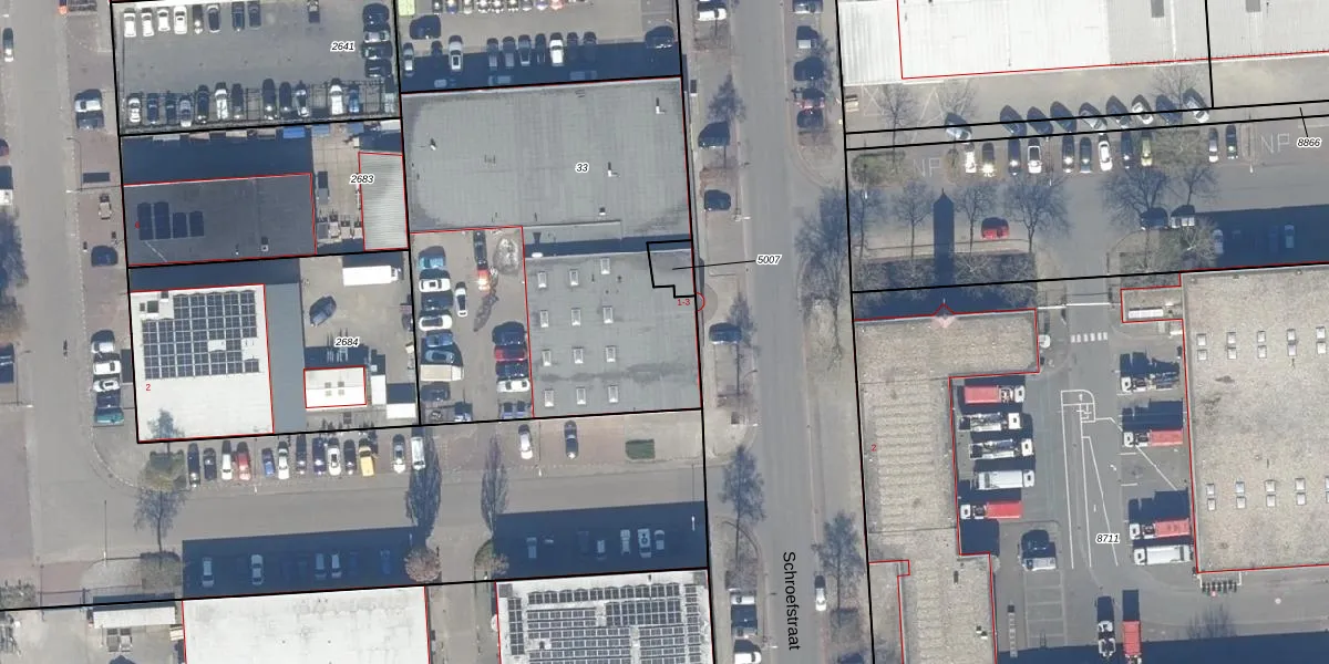 Het perceel waarop Schroefstraat 1 staat heeft een oppervlakte van 2081 m². Dit is een zeer groot perceel. De perceeloppervlakte wordt geregistreerd door het Kadaster. Gedetailleerde informatie over de maten van dit perceel kunt u vinden in het rapport Kadastrale kaart met maatvoering van Schroefstraat 1.