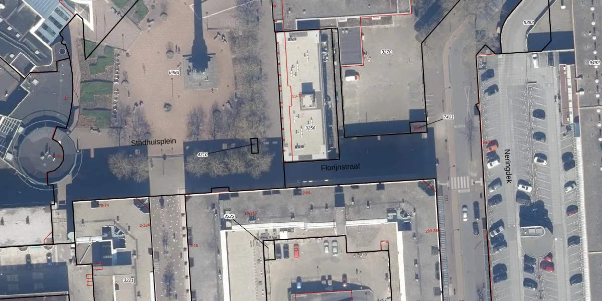 Het perceel waarop Stadhuisplein 105 staat heeft een oppervlakte van 809 m². Dit is een groot perceel. De perceeloppervlakte wordt geregistreerd door het Kadaster. Gedetailleerde informatie over de maten van dit perceel kunt u vinden in het rapport Kadastrale kaart met maatvoering van Stadhuisplein 105.