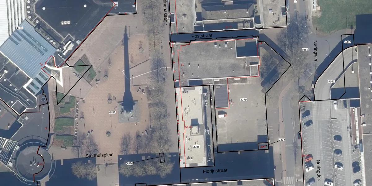 Het perceel waarop Stadhuisplein 111 staat heeft een oppervlakte van 809 m². Dit is een groot perceel. De perceeloppervlakte wordt geregistreerd door het Kadaster. Gedetailleerde informatie over de maten van dit perceel kunt u vinden in het rapport Kadastrale kaart met maatvoering van Stadhuisplein 111.