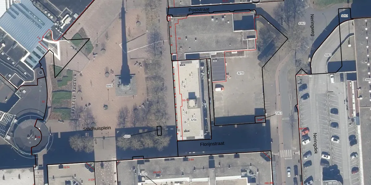 Het perceel waarop Stadhuisplein 115 staat heeft een oppervlakte van 809 m². Dit is een groot perceel. De perceeloppervlakte wordt geregistreerd door het Kadaster. Gedetailleerde informatie over de maten van dit perceel kunt u vinden in het rapport Kadastrale kaart met maatvoering van Stadhuisplein 115.