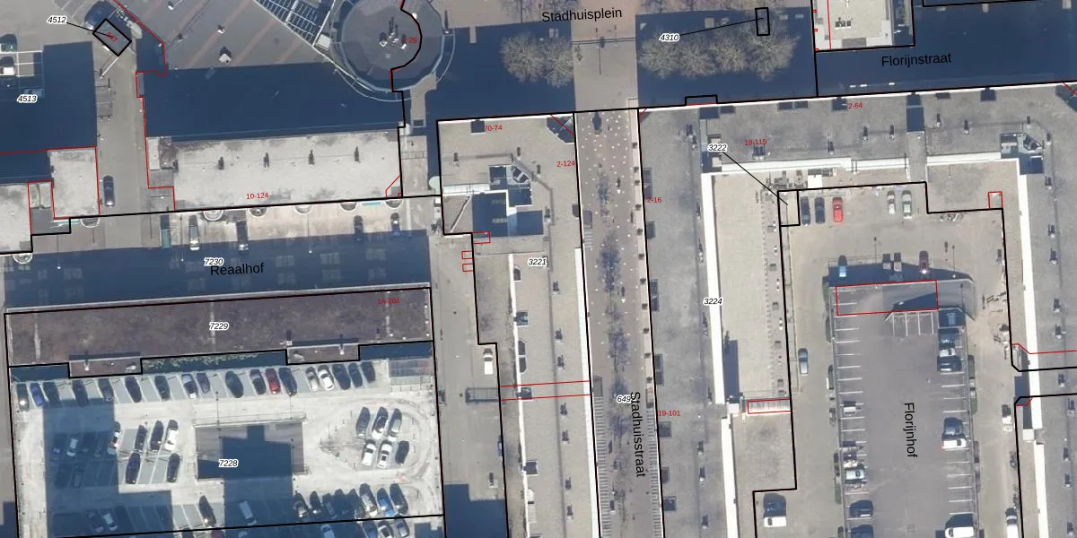 Het perceel waarop Stadhuisstraat 44 staat heeft een oppervlakte van 2176 m². Dit is een zeer groot perceel. De perceeloppervlakte wordt geregistreerd door het Kadaster. Gedetailleerde informatie over de maten van dit perceel kunt u vinden in het rapport Kadastrale kaart met maatvoering van Stadhuisstraat 44.