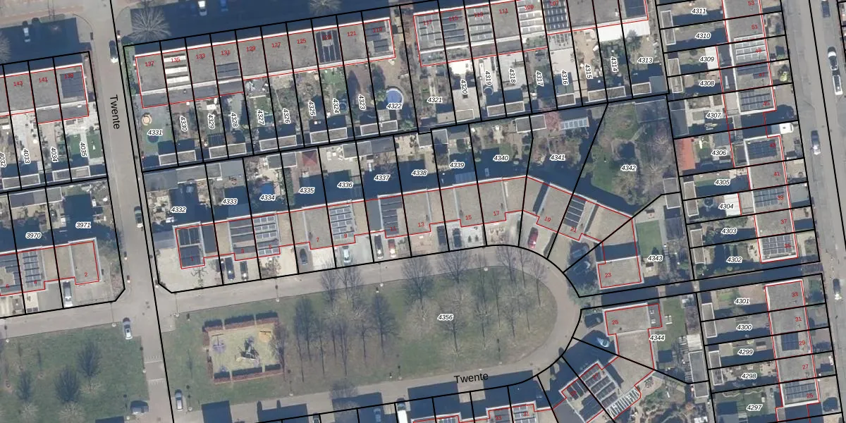 Het perceel waarop Twente 13 staat heeft een oppervlakte van 261 m². Dit is een middelgroot perceel. De perceeloppervlakte wordt geregistreerd door het Kadaster. Gedetailleerde informatie over de maten van dit perceel kunt u vinden in het rapport Kadastrale kaart met maatvoering van Twente 13.