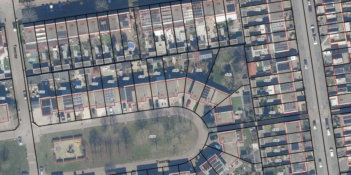 Het perceel waarop Twente 17 staat heeft een oppervlakte van 345 m². Dit is een groot perceel. De perceeloppervlakte wordt geregistreerd door het Kadaster. Gedetailleerde informatie over de maten van dit perceel kunt u vinden in het rapport Kadastrale kaart met maatvoering van Twente 17.