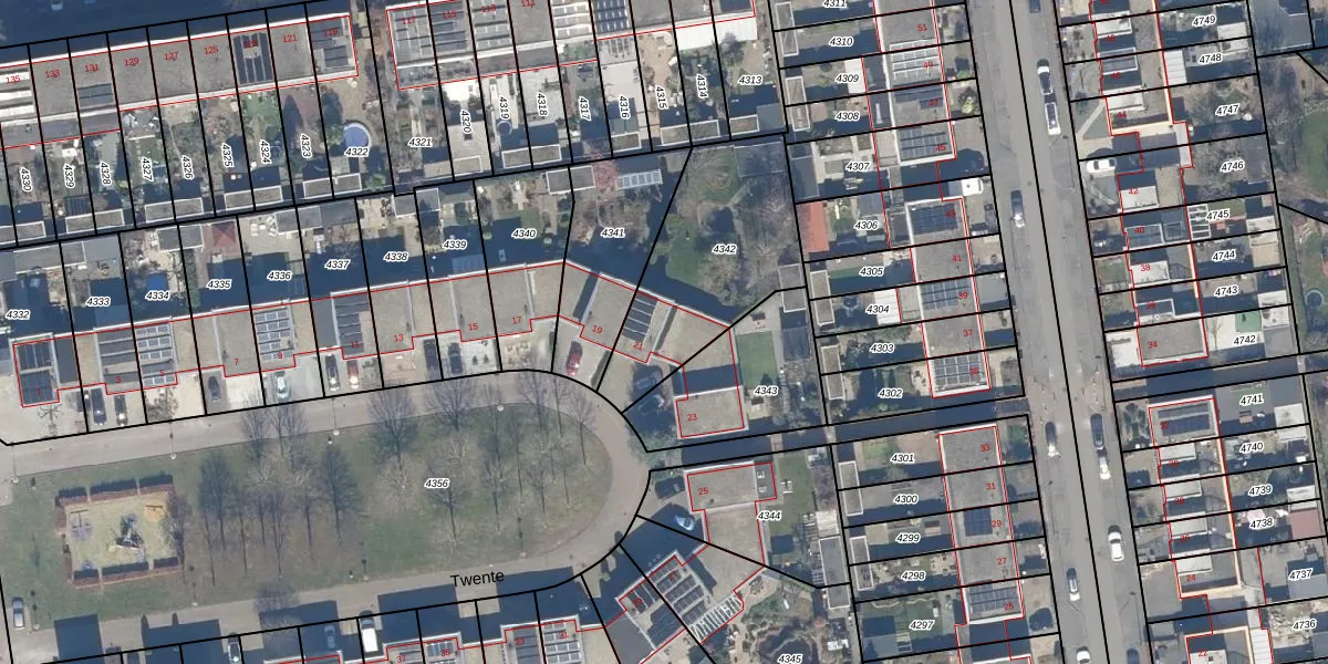 Twente 21 is gelegen op kadastraal perceel LLS00O4342. Deze kadastrale aanduiding is uniek en wordt gebruikt door het Kadaster om eigendomsrechten en andere zakelijke rechten vast te leggen. Het perceel maakt onderdeel uit van de kadastrale gemeente Lelystad.