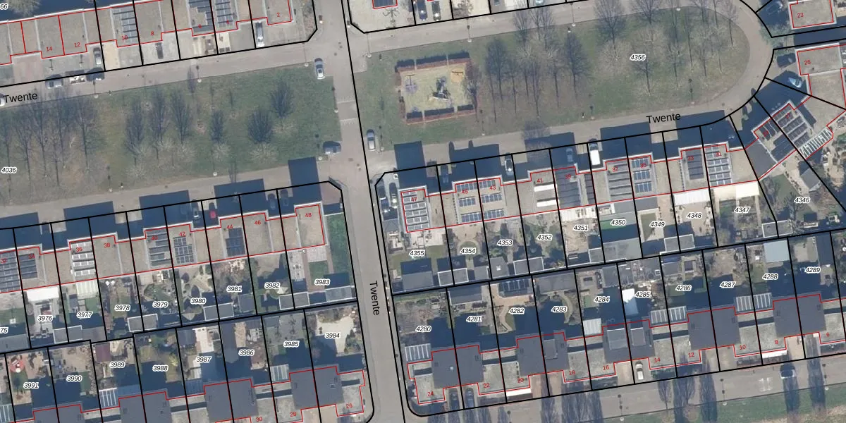 Het perceel waarop Twente 47 staat heeft een oppervlakte van 429 m². Dit is een groot perceel. De perceeloppervlakte wordt geregistreerd door het Kadaster. Gedetailleerde informatie over de maten van dit perceel kunt u vinden in het rapport Kadastrale kaart met maatvoering van Twente 47.