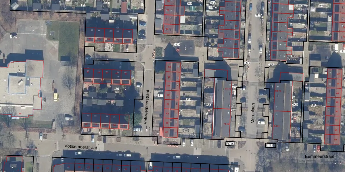 Het perceel waarop Veluwemeerstraat 57 staat heeft een oppervlakte van 1266 m². Dit is een zeer groot perceel. De perceeloppervlakte wordt geregistreerd door het Kadaster. Gedetailleerde informatie over de maten van dit perceel kunt u vinden in het rapport Kadastrale kaart met maatvoering van Veluwemeerstraat 57.