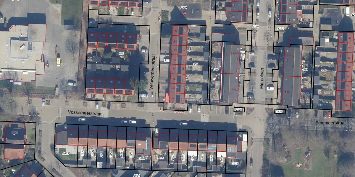 Het perceel waarop Veluwemeerstraat 65 staat heeft een oppervlakte van 1266 m². Dit is een zeer groot perceel. De perceeloppervlakte wordt geregistreerd door het Kadaster. Gedetailleerde informatie over de maten van dit perceel kunt u vinden in het rapport Kadastrale kaart met maatvoering van Veluwemeerstraat 65.