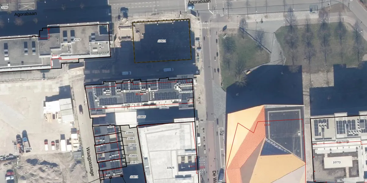 Het perceel waarop Waagstraat 110 staat heeft een oppervlakte van 1365 m². Dit is een zeer groot perceel. De perceeloppervlakte wordt geregistreerd door het Kadaster. Gedetailleerde informatie over de maten van dit perceel kunt u vinden in het rapport Kadastrale kaart met maatvoering van Waagstraat 110.