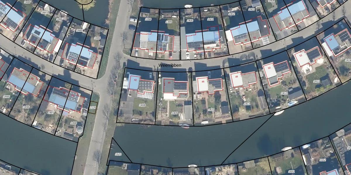 Het perceel waarop Weerribben 44 staat heeft een oppervlakte van 627 m². Dit is een groot perceel. De perceeloppervlakte wordt geregistreerd door het Kadaster. Gedetailleerde informatie over de maten van dit perceel kunt u vinden in het rapport Kadastrale kaart met maatvoering van Weerribben 44.