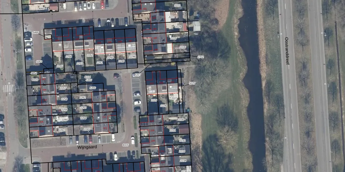 Het perceel waarop Wijngaard 215 staat heeft een oppervlakte van 160 m². Dit is een middelgroot perceel. De perceeloppervlakte wordt geregistreerd door het Kadaster. Gedetailleerde informatie over de maten van dit perceel kunt u vinden in het rapport Kadastrale kaart met maatvoering van Wijngaard 215.