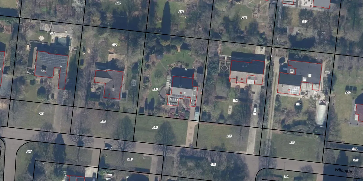 Het perceel waarop Wildbaan 11 staat heeft een oppervlakte van 1584 m². Dit is een zeer groot perceel. De perceeloppervlakte wordt geregistreerd door het Kadaster. Gedetailleerde informatie over de maten van dit perceel kunt u vinden in het rapport Kadastrale kaart met maatvoering van Wildbaan 11.