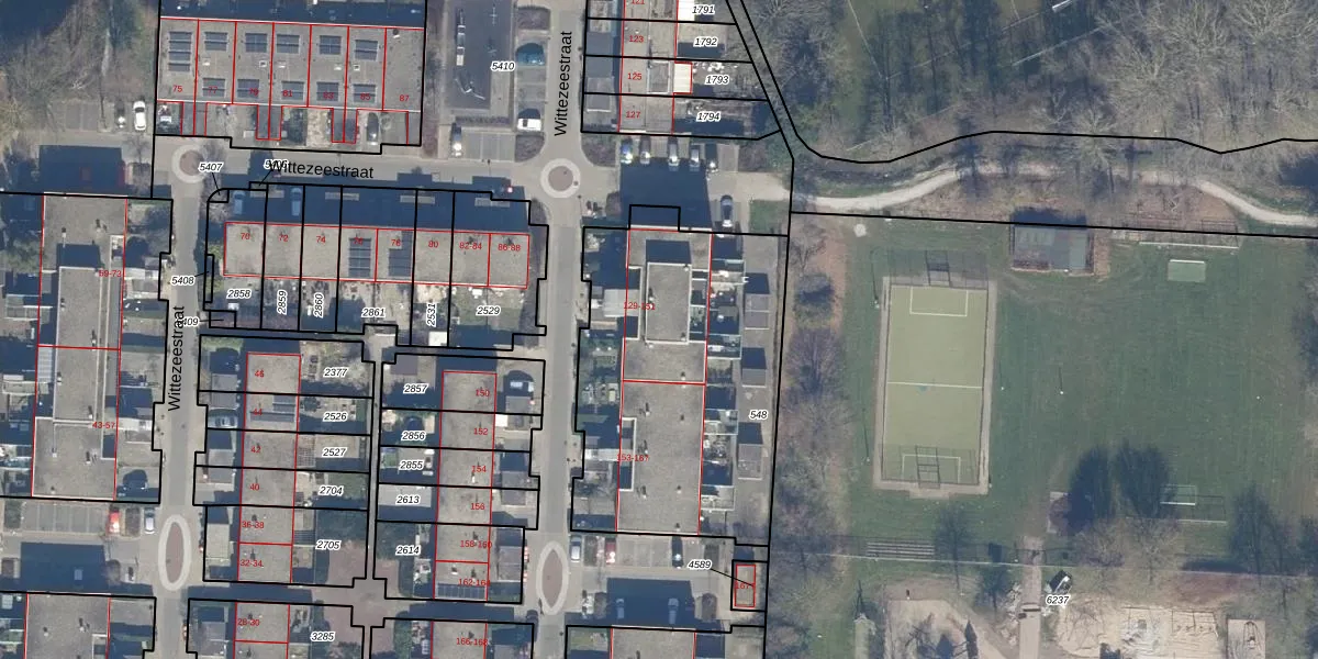 Het perceel waarop Wittezeestraat 137 staat heeft een oppervlakte van 1424 m². Dit is een zeer groot perceel. De perceeloppervlakte wordt geregistreerd door het Kadaster. Gedetailleerde informatie over de maten van dit perceel kunt u vinden in het rapport Kadastrale kaart met maatvoering van Wittezeestraat 137.