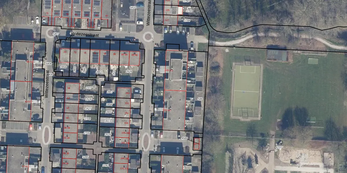 Het perceel waarop Wittezeestraat 147 staat heeft een oppervlakte van 1424 m². Dit is een zeer groot perceel. De perceeloppervlakte wordt geregistreerd door het Kadaster. Gedetailleerde informatie over de maten van dit perceel kunt u vinden in het rapport Kadastrale kaart met maatvoering van Wittezeestraat 147.