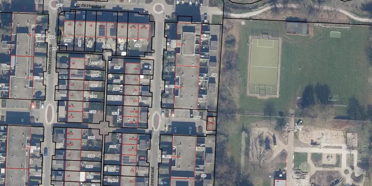 Het perceel waarop Wittezeestraat 165 staat heeft een oppervlakte van 1424 m². Dit is een zeer groot perceel. De perceeloppervlakte wordt geregistreerd door het Kadaster. Gedetailleerde informatie over de maten van dit perceel kunt u vinden in het rapport Kadastrale kaart met maatvoering van Wittezeestraat 165.