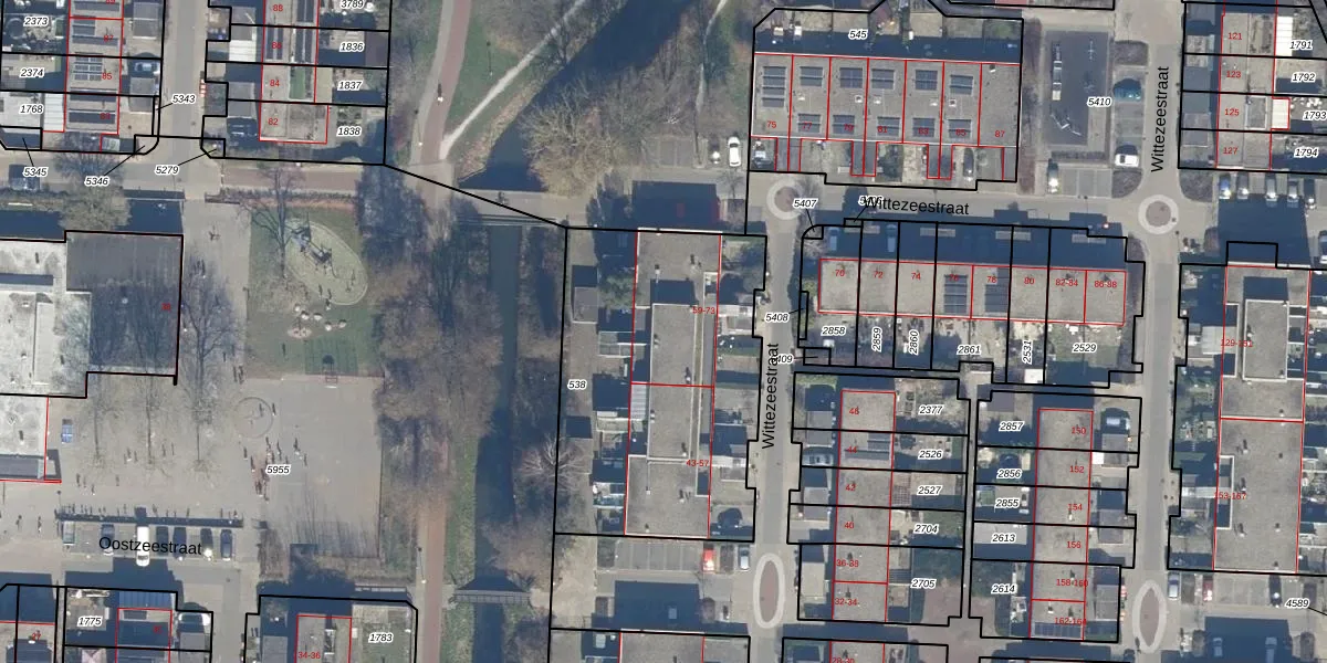 Het perceel waarop Wittezeestraat 65 staat heeft een oppervlakte van 1368 m². Dit is een zeer groot perceel. De perceeloppervlakte wordt geregistreerd door het Kadaster. Gedetailleerde informatie over de maten van dit perceel kunt u vinden in het rapport Kadastrale kaart met maatvoering van Wittezeestraat 65.