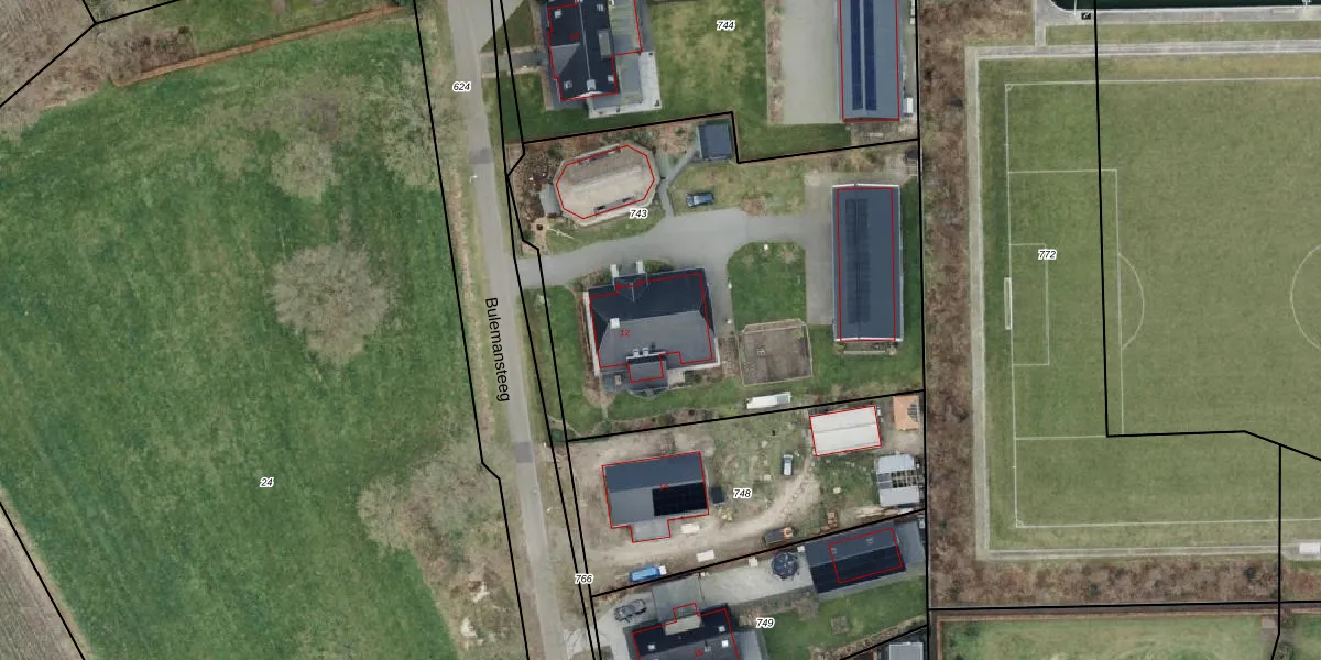 Het perceel waarop Bulemansteeg 12 staat heeft een oppervlakte van 2449 m². Dit is een zeer groot perceel. De perceeloppervlakte wordt geregistreerd door het Kadaster. Gedetailleerde informatie over de maten van dit perceel kunt u vinden in het rapport Kadastrale kaart met maatvoering van Bulemansteeg 12.