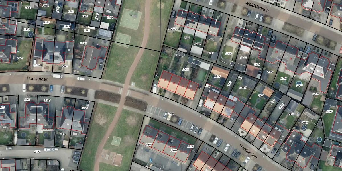 Het perceel waarop Hooilanden 28 staat heeft een oppervlakte van 860 m². Dit is een groot perceel. De perceeloppervlakte wordt geregistreerd door het Kadaster. Gedetailleerde informatie over de maten van dit perceel kunt u vinden in het rapport Kadastrale kaart met maatvoering van Hooilanden 28.